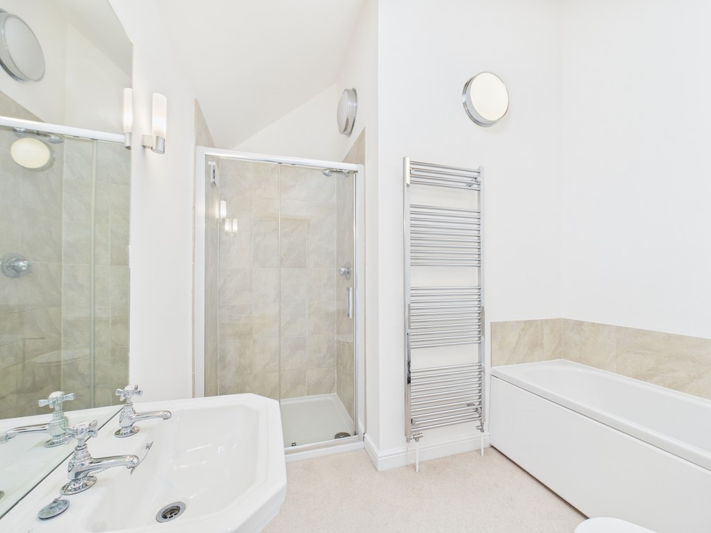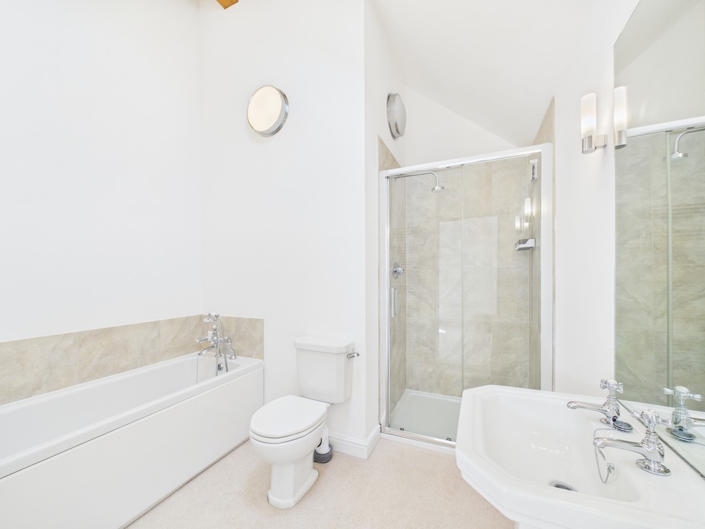 ENSUITE 5'8 ( excluding shower) x 8'9 Fitted bathroom with double sized shower cubicle, white panelled bath with telephone style shower taps, low level WC and pedestal hand wash basin.